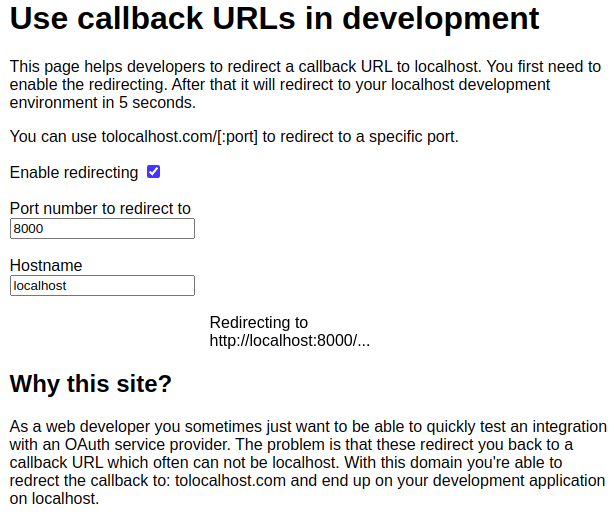 3. Then scroll down and instead of localhost:8000 (Google does not allow it), use https://tolocalhost.com/. You need to Enable redirecting and set your Port.